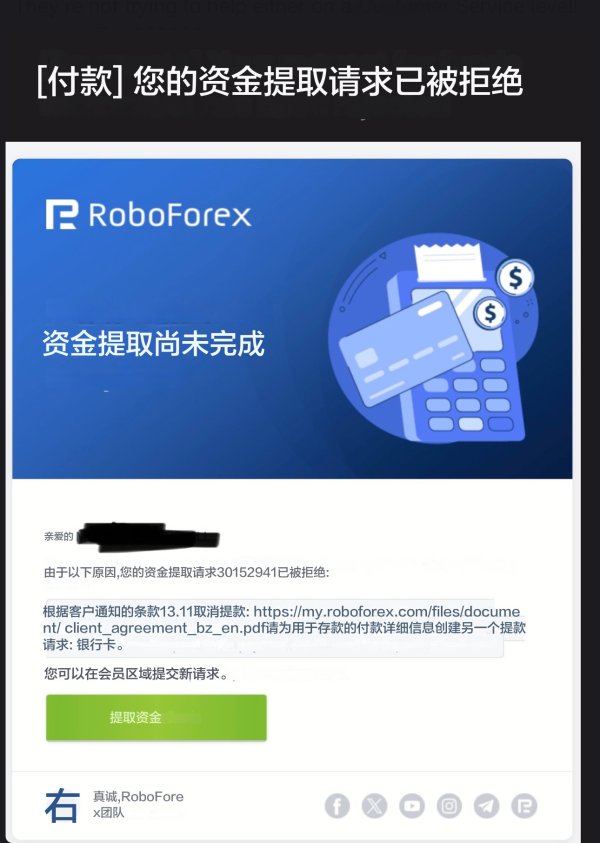 两周前我在RoboForex存了钱,现在想提现却被阻止。