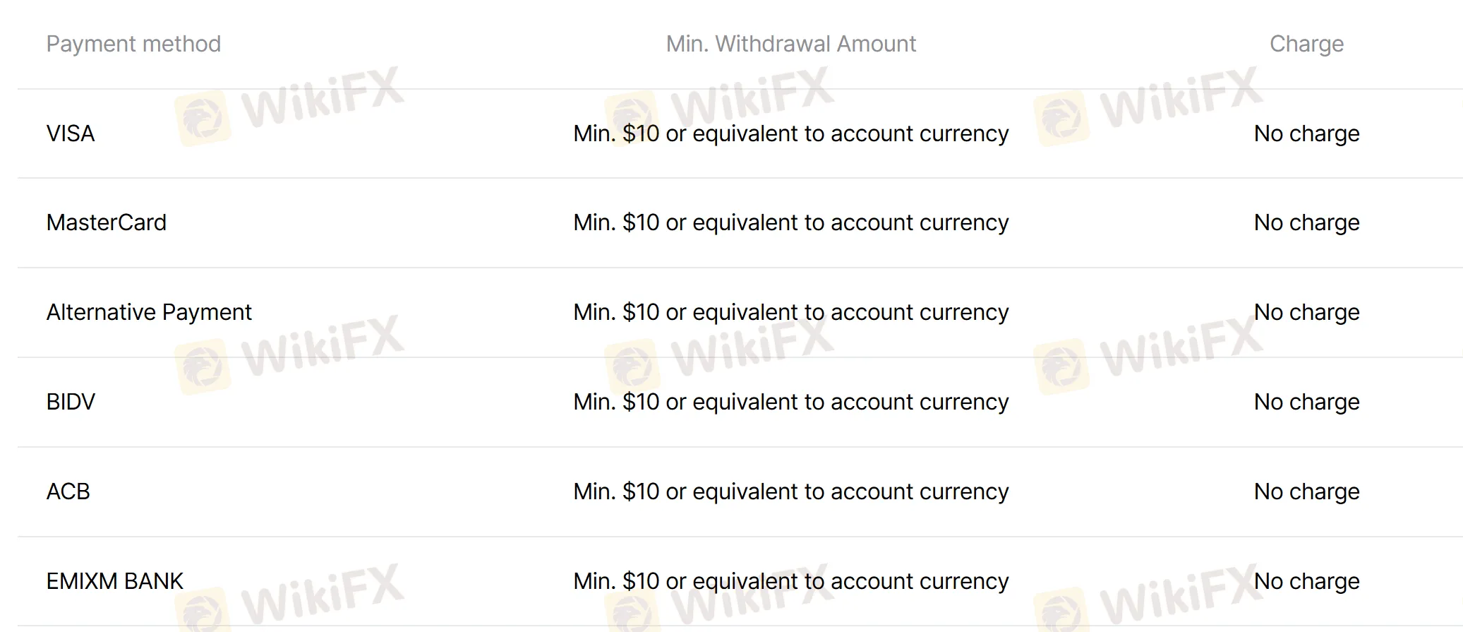 | VISA, MasterCard, Alternative Payment, BIDV, ACB, EMIXM BANK, etc. | $10或等值于账户货币 | ❌ | / |
