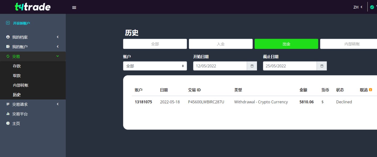 无良T4trade黑平台,拒绝出金,擅自篡改交易记录,将盈利和本金抹去