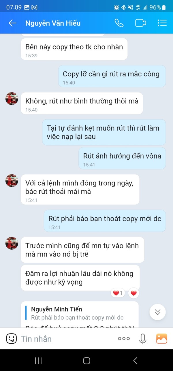 tôi có tạo tài khoản trên cjc markets và giao dịch ib sàn luôn kêu tôi copy trade đi cho nhàn, tôi đã từ chối không đồng ý copy trade, nhưng khi tôi đặt lệnh rút tiền sàn đã tự copy trade tài khoản của tôi vào một tài khoản ảo nào đó đánh cháy tài khoản của tôi nhằm không cho tôi rút tiền, tôi đã không đồng ý copy trade từ đầu rồi, đó là một trò gian lận của sàn, tôi có liên hệ với sàn thì sàn ko giải quyết,. và đây là bằng chứng ib kêu tôi copy trade tôi đã từ chối, và tôi đặt lệnh rút tiền, sàn đã tự đưa tôi vô tài khoản copy trade ảo nào đó đánh âm tài khoản của tôi nhằm không cho tôi rút tiền. và đây là cuộc trò chuyện với sàn, sàn đỗ lỗi ib lừa tôi và lừa luôn cả sàn, bộ sàn dễ lừa vậy sao mong xem xét lại ạ.
