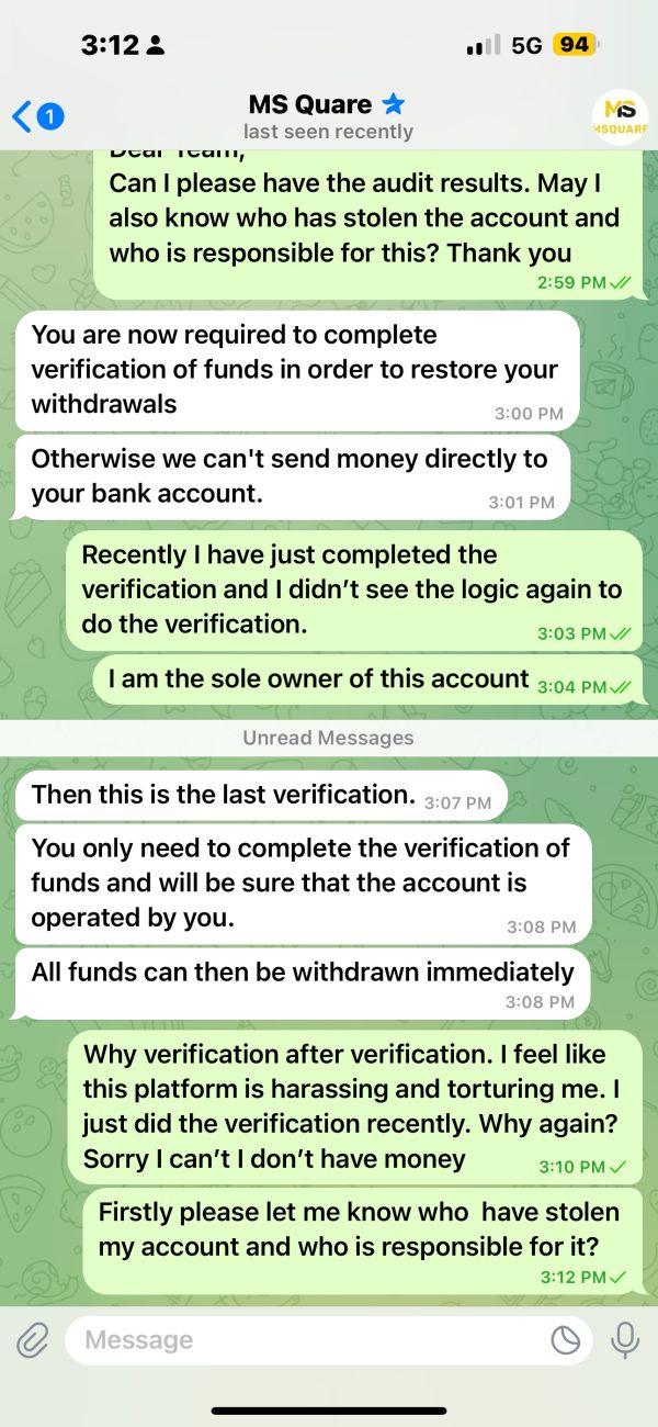 I joined the MSquare group recently and I have deposited 4 times with only 100USD withdrawan so far. I withdraw 1000USD after my third deposit and I was notified by customer service that my withdrawal is being reviewed. Later I am asked to deposit 30% of the total funds to complete one time verification as my account is identified as robot account after which I will have normal access to withdrawals. I deposited and verified as advised. After few days I again initiated withdrawal of 2000USD and same thing happened. I was again asked to deposit the funds and complete verification to have normal withdrawals. The group said as per audit results my account is stolen and not operated properly. I requested the online CS team to send me the audit reports who has stolen my account but they didn’t sent me. I even sent mails to the management of the company to get the issues sort out but it never happened. I didn’t get the logic why I need to verify and deposit the funds again and again