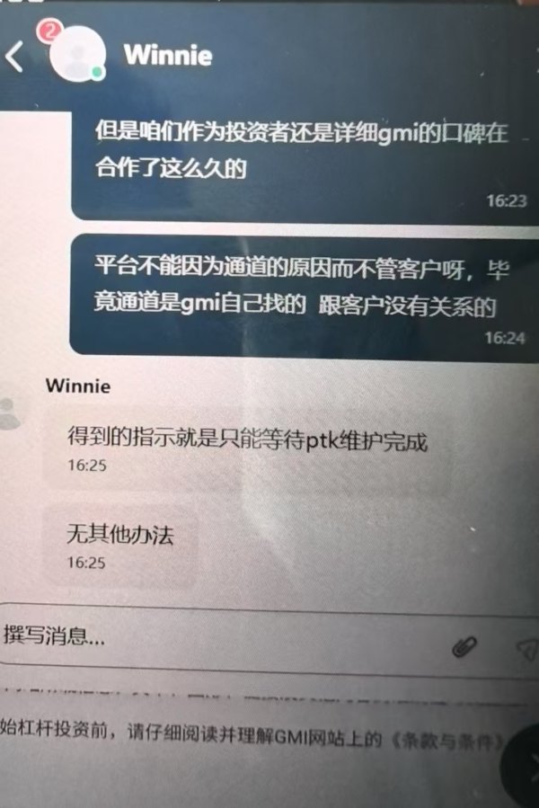 gmi从宣布退出后就开始提交出金,前期还陆续到了几笔,后期就直接不处理了,平台甩锅说资金到了ptk钱包,实际上什么情况作为客户是不知道,我们是看平台开户的,所以出金问题就应该平台来承担,16年的老平台做出来这样的事也是厚颜无耻,行业败类!跑路居然都说的这么冠冕堂皇,现在是没有人能联系上真的跑的彻底
