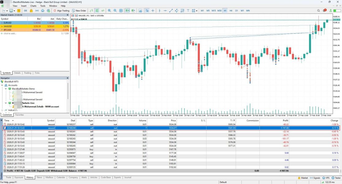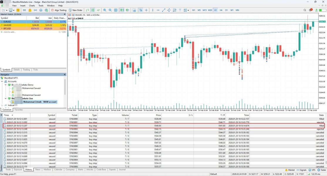I am reporting serious execution issues with BlackBull Markets On 29 Jan 2026, my Buy Stop order (#57433892) was executed at 5542.28 (10:13:14). However, MT5 tick data shows the maximum Ask price was only 5541.99 (10:13:00–10:13:59). This indicates execution at a price not present in market data. The broker justified this using VWAP, but: Other trades (#57433890, #57433888) show multiple partial fills This trade was executed as a single fill with no breakdown There is also a contradiction: execution at Ask 5542.28 but TP (5541.93) not triggered. Additionally, my account was set to “close-only” on 6 March, yet orders executed on 9 March. Issues also observed on small lots (0.01–0.2). I encourage traders to verify execution data and monitor pricing consistency when trading.