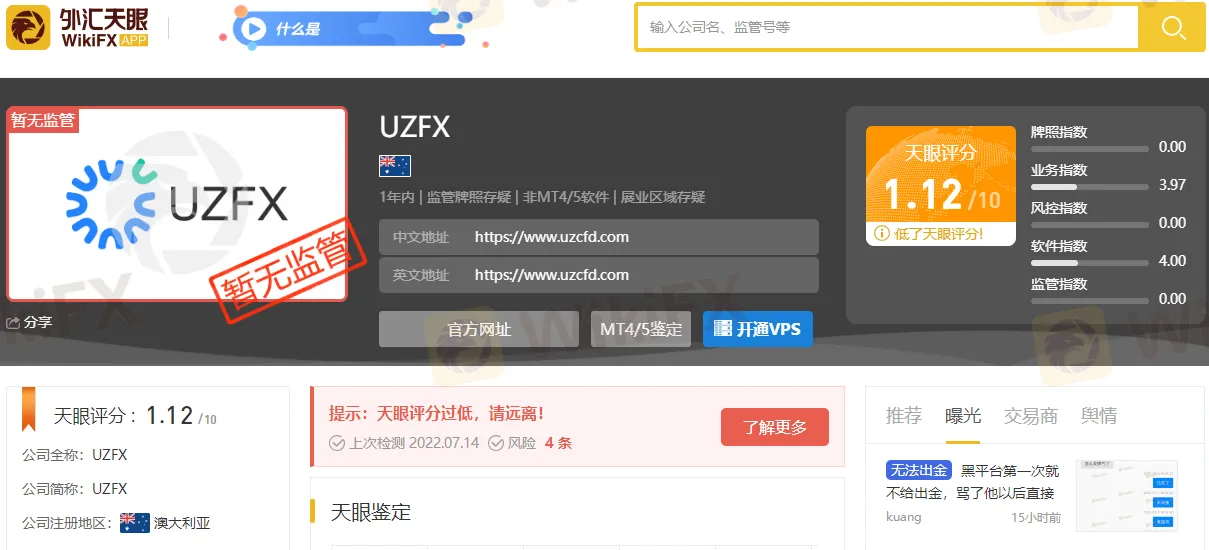 在天眼首页搜索UZFX后可以看到他们的平台,评分很低