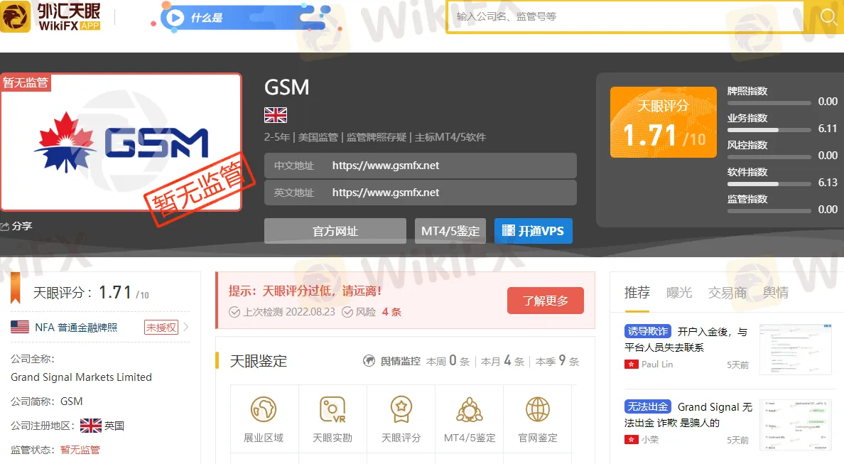 近日有相当多的客户,向我们外汇天眼投诉黑平台GSM,这个黑平台 Grand Signal Markets Limited用简称GSM交易盈利不给出金,账号也无法登入了,人直接消失完全找不到请注意这个平台,他们疑似有多个网站,最后都会引导到 Grand Signal Markets Limited平台开户