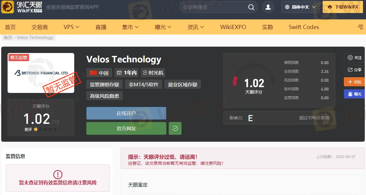 其实有很多方法可以避免出现这样的情况,在做外汇和其他交易之前,可以在我们外汇天眼上面先检索一下该平台是否可靠,就拿Velos Technology平台举例,在天眼首页搜索Velos Technology可以得出如下结果: