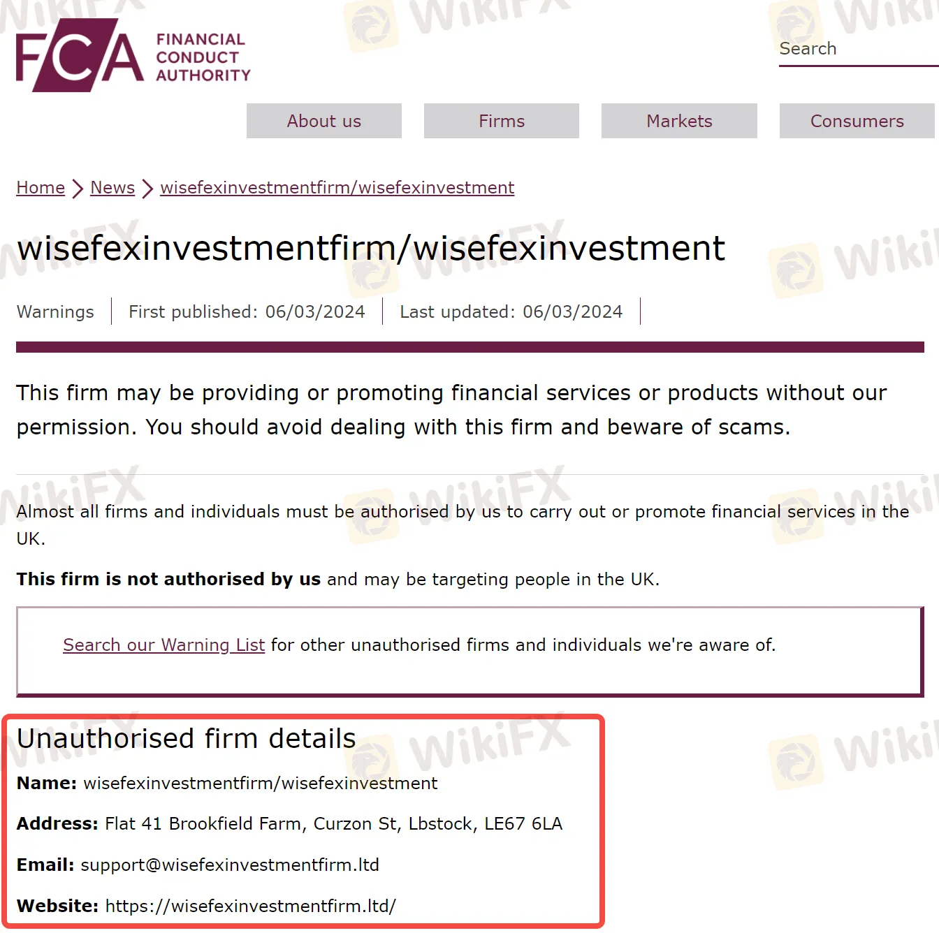 FCA表示,根据英国法律,几乎所有在英国境内提供、推广或销售金融产品或服务的公司和个人,都必须获得FCA的正式授权许可。但据FCA调查,wisefexinvestmentfirm/wisefexinvestment从未获得过FCA的任何形式的金融业务许可。