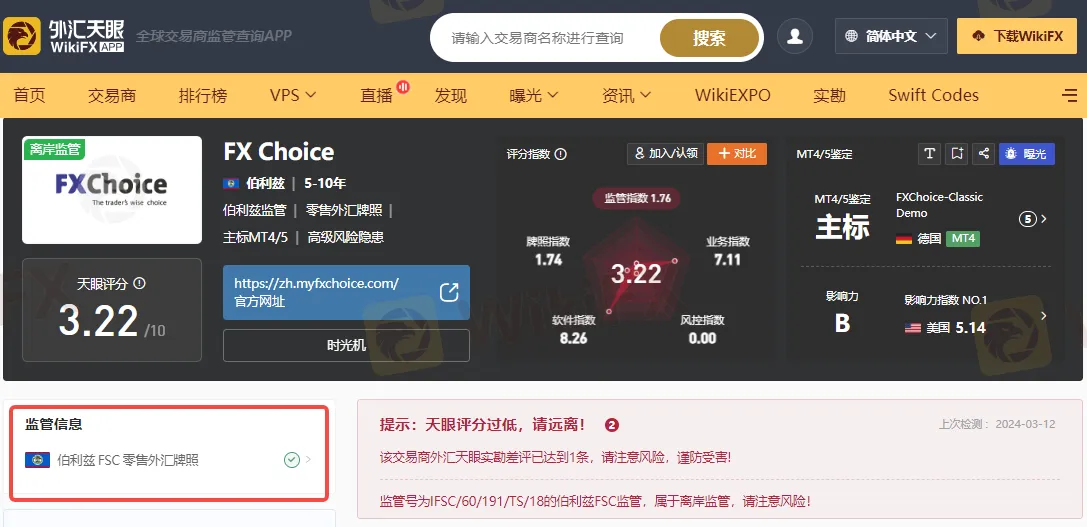 通过外汇天眼查询可知,FXChoice 起源于伯利兹,并受当地国际金融服务委员会 (IFSC) 监管,持有伯利兹金融服务委员会 (FSC)零售外汇牌照,而伯利兹FSC监管,属于离岸监管,可以相对容易地获得外汇交易许可证。