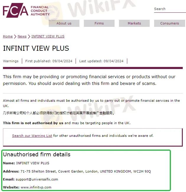 FCA认为INFINIT VIEW PLUS存在欺诈投资者、非法集资等严重违法行为的可能。并警告投资者不要与该公司进行任何交易或投资,如果一旦遭受资金损失,将无法使用金融申诉专员服务或受到金融服务补偿计划 (FSCS) 的保护。