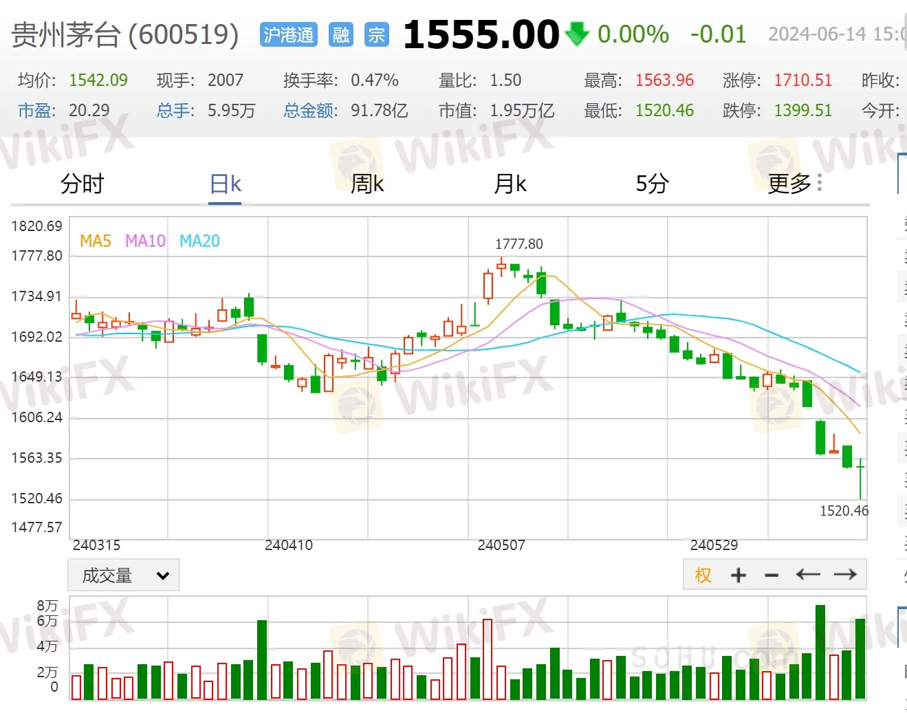 茅台酒极具金融属性,坊间堪比硬通货,作为大盘股王的贵州茅台更是受到机构及实力散户的青睐。酒价暴跌,也导致股价接连遭遇抛售。5月初,贵州茅台到达1777元年内高点,K线上高位收出跳空高开阴阳黄昏星,第三天收出低开阴十字,随后便开始了一个多月的下跌趋势,股价自高位跌去了近250点。茅台的下跌,势必带动整个白酒甚至吃喝板块集体吹冷气。作为中证A50股第一权重,如果茅台持续走低,对整个大盘来说都不是一件好事。
