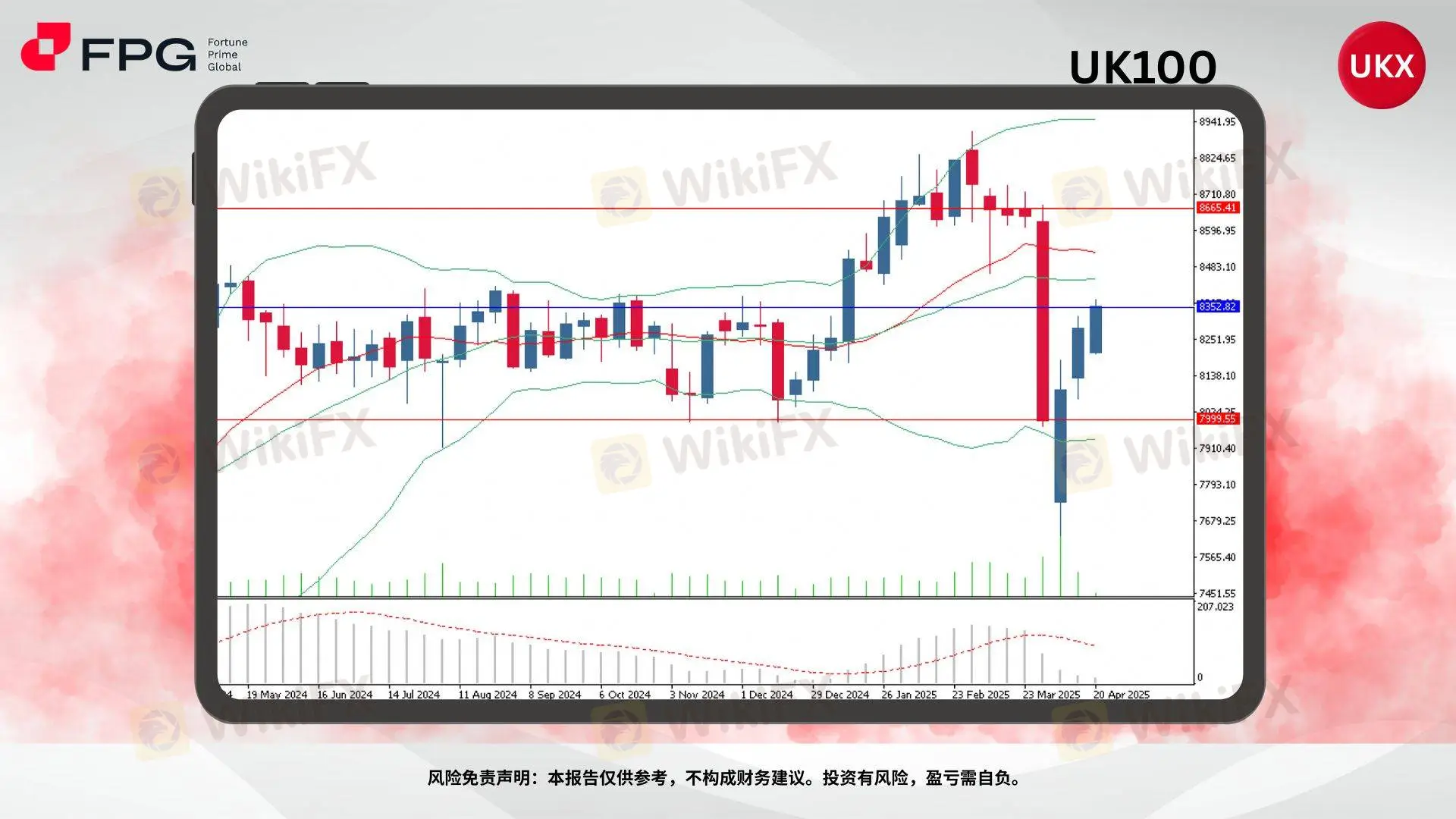 自8665.41水平大幅下跌后,UK100在7999.55附近获得坚实支撑,并在周线图上形成强势的吞没形态,预示可能出现趋势反转。布林带出现扩张,反映出市场波动性增强,且价格已成功突破中轨(20周期均线),从技术面进一步支持反弹走势。
