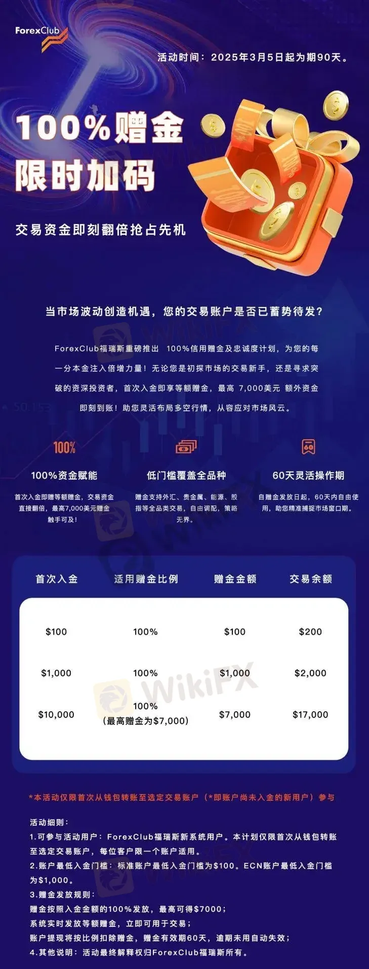 赠金按照入金金额的100%发放,最高可得$7000;