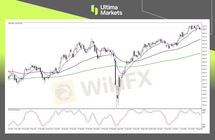 摘要:今日Ultima Markets 为您带来了 2025年8月8日的富时100深入分析UK100 技术分析UK100 日线图表分析(UK100 日线图,来源Ultima Markets MT5)随机振荡指标:指标从80上方的超买水平下跌,并出现看跌交叉,显示上涨动能正在减弱,未来可能出现盘整或更深的回档。关键支撑区域:如果抛售压力持续,跌破紫色短期移动平均线可能触发黑色中期移动平均线8935附近关键