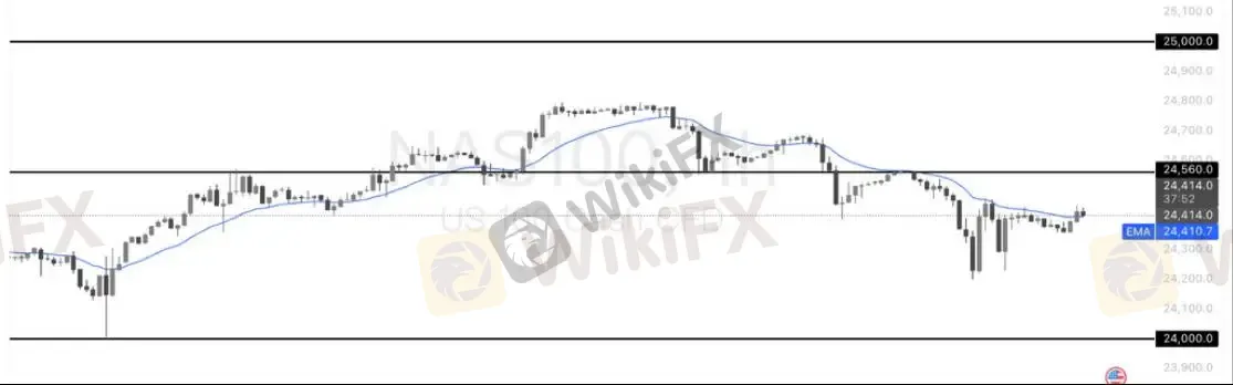 纳指100在PCE数据公布前维持震荡格局,短线在24,560压力与24,000支撑区间内波动。价格此前跌破EMA后承压下行,但在24,300附近获得支撑,MACD双线出现拐头迹象,动能柱逐步转正,显示空头动能有所缓解。整体来看,市场在关键数据前保持观望,若突破24,560将打开反弹空间,反之跌破24,000则可能加速回调。