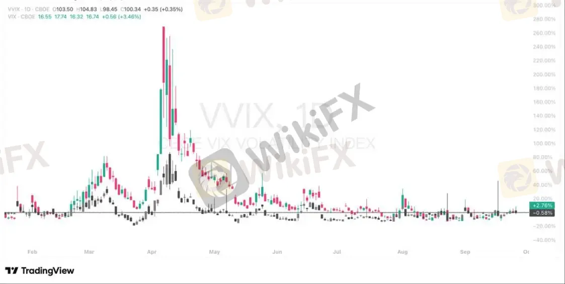 昨日,VIX与VVIX在小幅反弹后回落,最终仍录得上涨,显示市场隐含波动率维持在相对高位。当前叠加特朗普关税政策带来的不确定性,以及强劲经济数据对美联储降息路径的扰动,市场风险偏好承压,短期内波动率指数仍存在再次抬升的可能性,需警惕避险情绪阶段性升温。