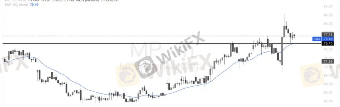 技术面显示,MP股价在快速回踩71附近后出现强力反弹,突破75关口并拉升至80上方,显示买盘明显增强。目前价格回踩至77一带并企稳于20均线上方(EMA 75.46),短线保持强势格局,75一线已由压力转为支撑,若能稳住该区间,后续有望再次冲击80甚至82;反之跌破75,则可能回测71附近支撑。整体趋势偏强,关注75—80区间的整理与突破方向。