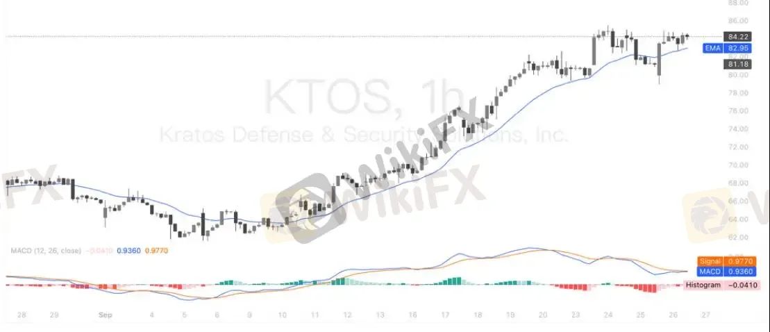 技术面,KTOS延续强势上行后在84附近横盘整理,短线守住EMA20(82.95)支撑,显示上升动能仍在蓄积。整体来看,若能突破85关口,有望延续上行趋势;反之跌破83,则可能进入更深的震荡整理。