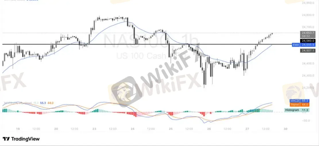 纳指100在24,200附近企稳后强势反弹,已突破并站上24,560关键水平及20小时均线,MACD形成金叉并转正,显示短线多头动能增强;若能守稳该支撑,后续有望继续上攻24,700并挑战25,000整数关口,整体趋势有转多迹象。