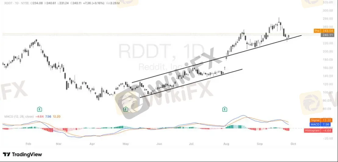 Reddit在前期回调后于225美元支撑位附近企稳,并出现明显反弹迹象,短线走势延续反弹趋势。若该水平能持续守稳,将为进一步上攻提供动能。