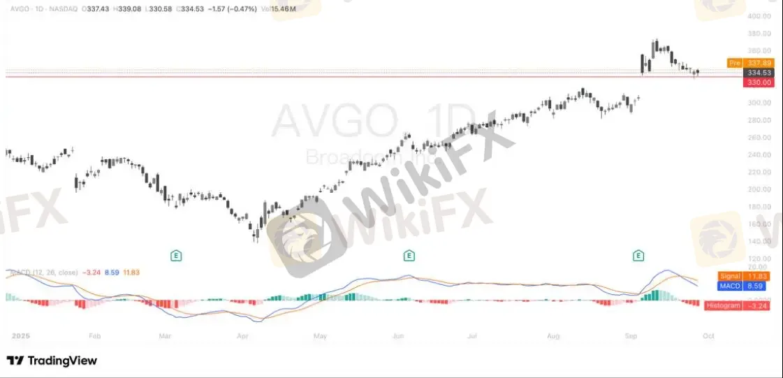 从技术面来看,博通股价自年内高位回落,目前在330美元支撑位附近企稳,MACD显示一定多头力量,短期或延续震荡或恢复上升趋势。基本面方面,公司过去两年营收增长30%,毛利率达76.1%,充足自由现金流支持增长投资及股东回报。2025年以来,受强劲盈利和人工智能题材利好推动,股价累计上涨近40%,明显跑赢大多数科技股。
