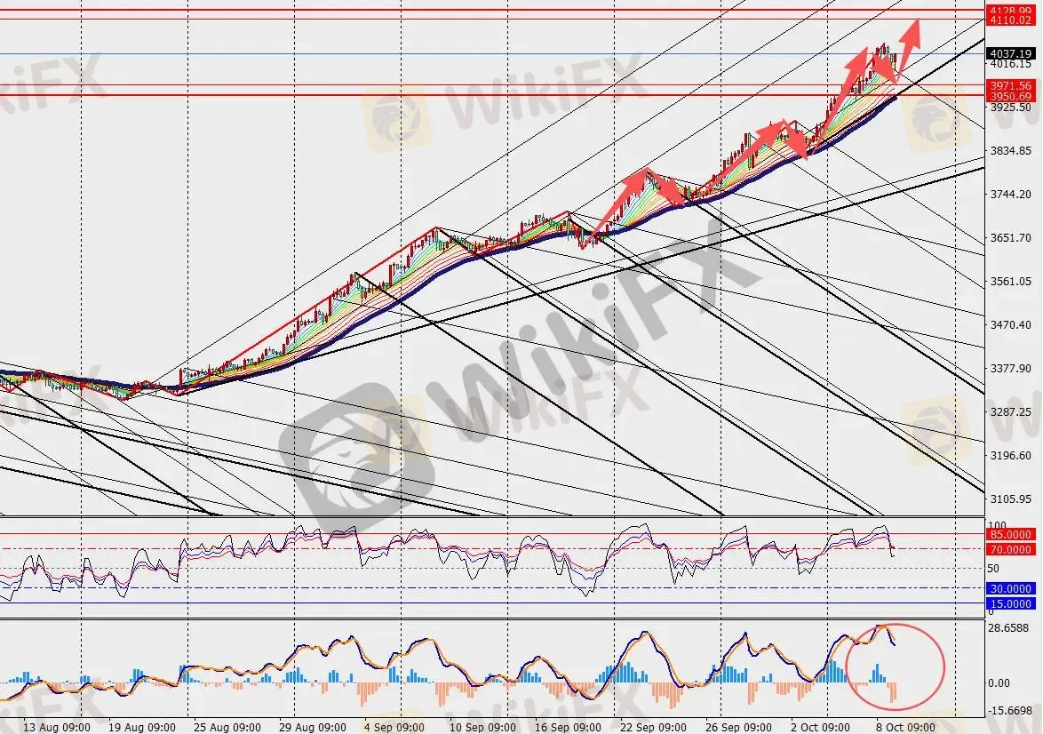 黄金H4级别高位震荡,MACD双线和量能柱在零轴附近收敛。当黄金的RSI接近80时,通常意味着它已接近顶部,回调很快就会到来。当RSI超过70时,通常意味着资产处于超买状态。这一数据表明,金价在过去一个多月里一直处于超买状态。