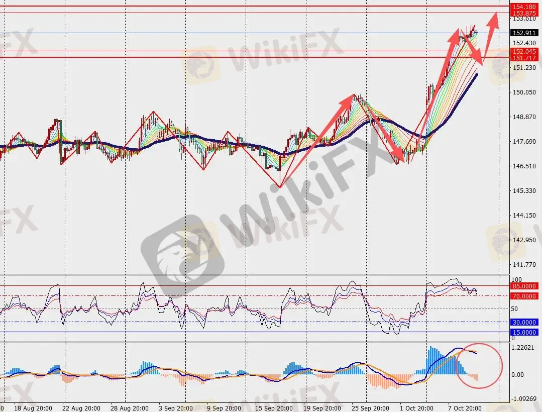 技术面:美元兑日元H4级别超买震荡,并在48日多空分界线上方运行。此外,MACD双线和量能柱在零轴上方扩张。美元兑日元突破153.00关口,该货币对在九个月高位区间震荡整理,目前下行空间暂被限制在152.00关口之上。