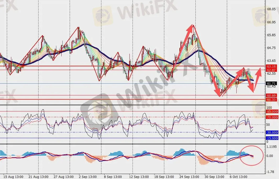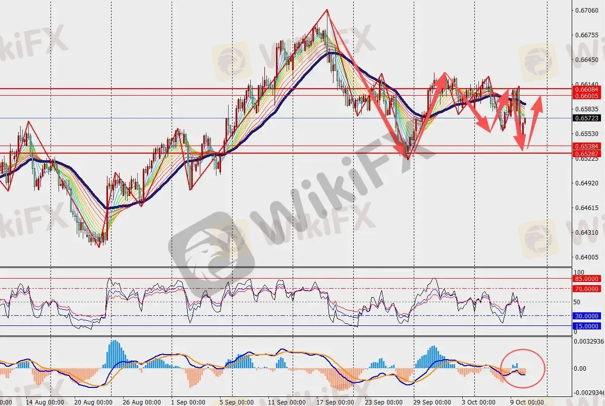 技术面:澳元兑美元H4级别下跌反弹,但依旧在48日多空分界线下方运行。此外,MACD双线和量能柱在零轴下方底背离收敛。这使得澳元对同类非美的相对强弱略有优势,但在美元反弹的对冲下,优势暂时难以转化为对上方关口的持续突破。