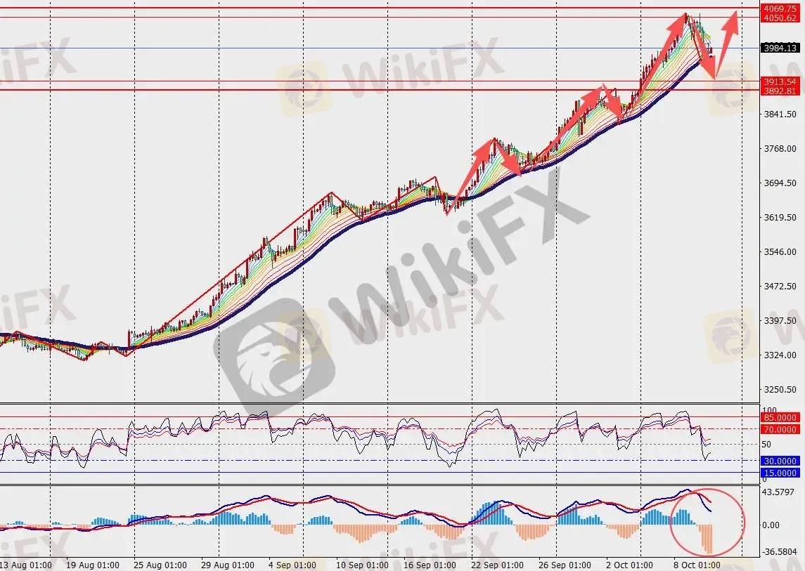 技术面:黄金H4级别高位回落,并回到48日多空分界线附近。然而,MACD双线和量能柱开始在零轴上方收敛。此前金价涨势如此之快,以至于在3850美元之前都没有遇到真正的支撑。