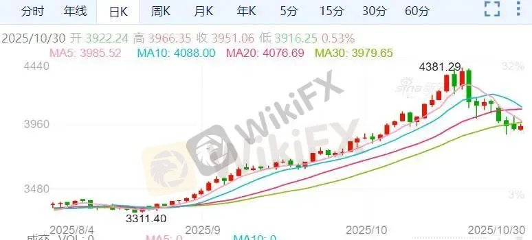10月29日,金价大幅收窄涨幅。尽管美联储如市场预期宣布降息25个基点,将利率下调至3.75%-4.00%的区间,但金价最初的乐观情绪很快被主席鲍威尔的谨慎言论所冲淡。现货黄金最终收报每盎司3964.39美元,日内仅上涨0.3%,远低于盘初一度飙升2%的高点。