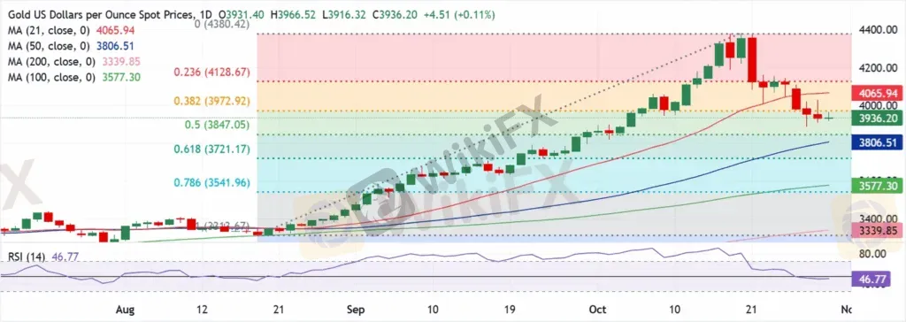 下行支撑位是 $3,847(50% 回撤位),然后是 $3,721(61.8%)、$3,542(78.6%)和 $3,314(100% 的衡量升势)。只要价格持稳在上升的 50 和 100 SMA 上方,回调幅度可能仍然较小,而日线收盘价回到 $3,973 以上将是买方重获牵引力的近期信号。