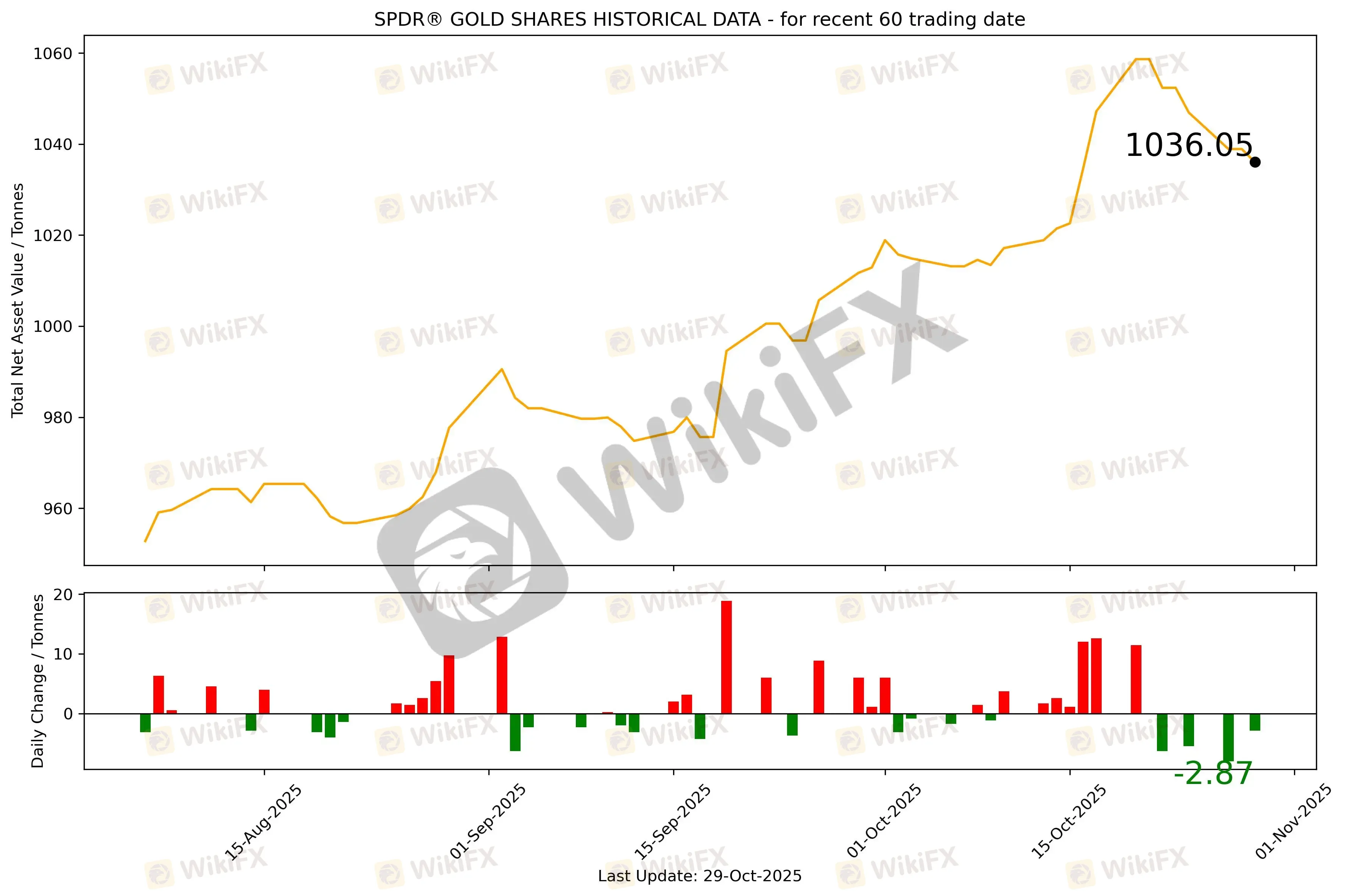 截至10月29日,全球最大的黄金ETF SPDR Gold Trust持仓量为1036.05吨,较上一个交易日减少2.87吨。10月29日现货黄金看盘于3952.29美元/盎司,经历一波明显的上升趋势,美盘盘前最高向上触及4030.23美元/盎司,随后在高位横盘震荡后快速转入下行,形成典型的“冲高-滞涨-下破”结构。最终收于3928.77美元/盎司,跌23.551美元或0.6%。