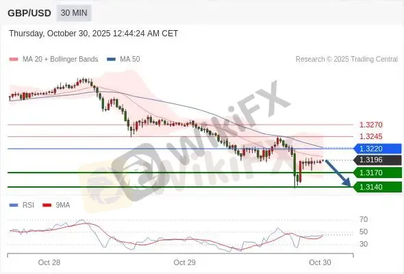 当日内短期关键阻力位在1.3220,转折点在1.3220。