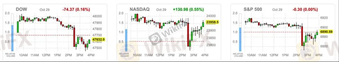 盘中因 FOMC 利率决议出现震荡。美联储宣布降息25个基点,将联邦基金利率区间下调至 3.75%–4.00%,符合市场预期,但官员意见出现分歧。鲍威尔在记者会上表示,政府关门导致经济数据不足,12 月是否再降息仍未确定。市场随即下调12月降息概率,从超过 90%降至67% ,三大指数短线回落。