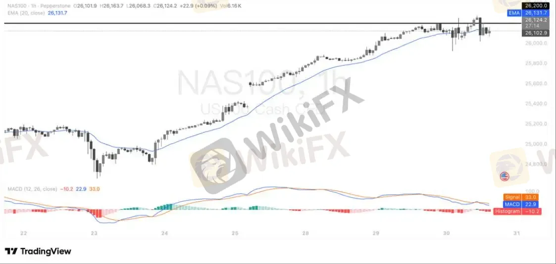 NAS100在经历一波强势上行后,目前在 26,200 附近形成明显阻力区,价格多次测试未能突破。短期内,K线运行在 20EMA(26,131)附近震荡整理,显示动能有所减弱。MACD出现金叉后的回落迹象,柱状图转为负值,表明多头动能衰退。若价格持续受压于26,200下方,可能出现短线回调测试26,000支撑;若放量突破并稳站其上,则有望延续上升趋势。