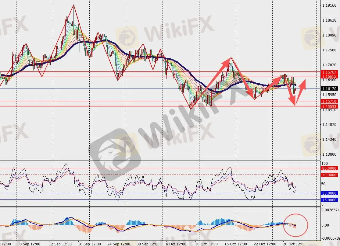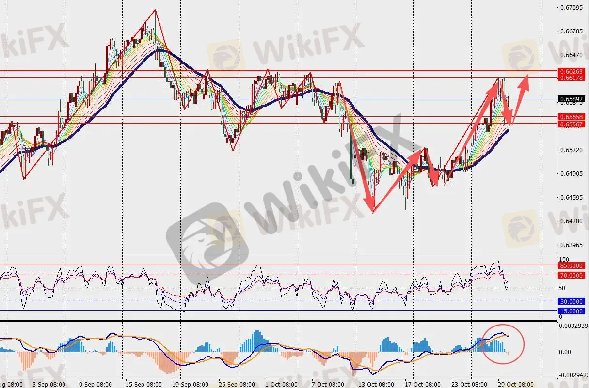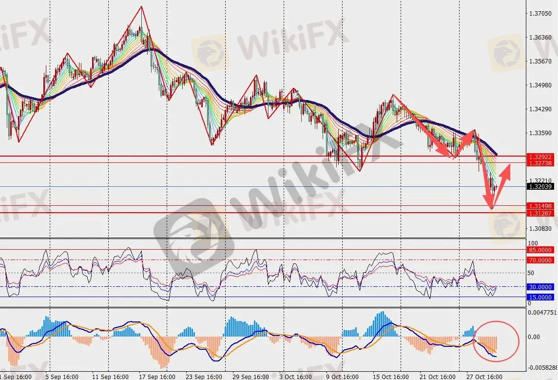 技术面:英镑兑美元H4级别超跌反弹,但依旧在48日多空分界线下方运行。然而,MACD双线和量能柱在零轴下方收敛。生产率预测每下调0.1个百分点,公共部门净借款将增加约70亿英镑。因此,若下调0.3个百分点,财政缺口可能高达210亿英镑。