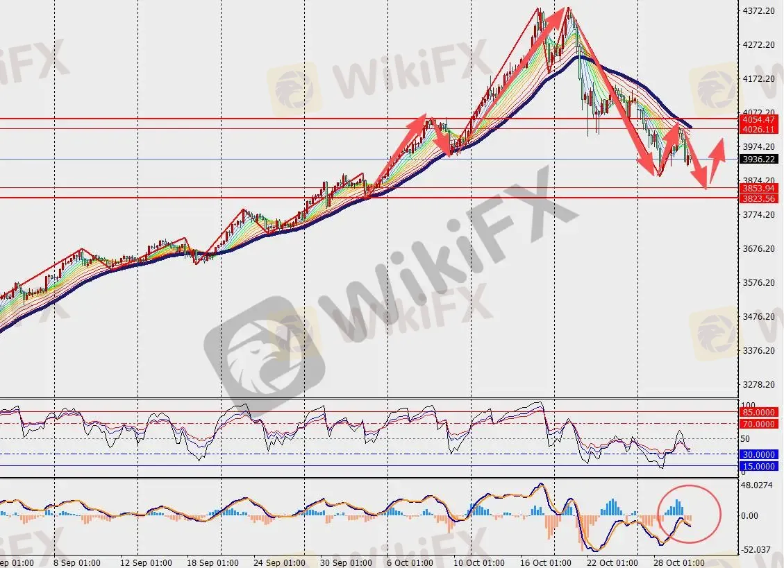 技术面:黄金H4级别低位震荡,并在48日多空分界线下方运行。此外,MACD双线和量能柱在零轴下方小幅扩张。回调使得黄金本周迄今跌幅超过3%,部分原因也在于全球贸易紧张局势出现缓和迹象,尽管今年以来金价仍累计上涨了51%。