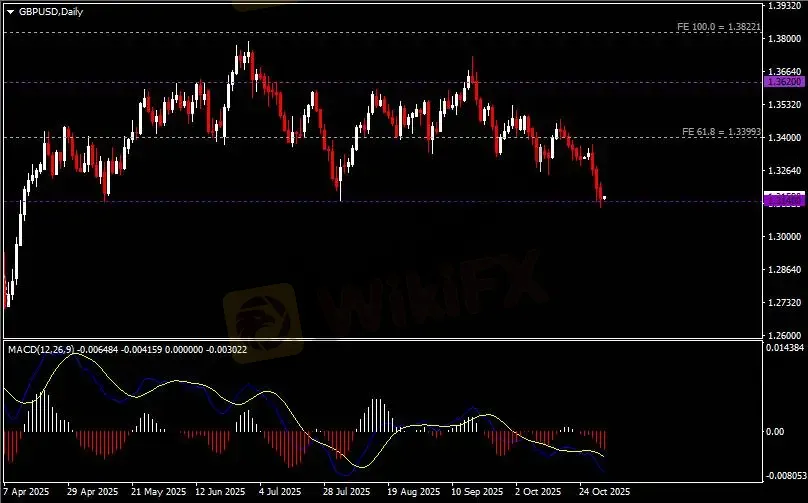 日线图显示英镑兑美元震荡下挫,当前测试1.3140支撑。从MACD来看,快慢线向下扩张,红色动能柱温和放量。汇价走势基本和动能柱的变化一致。