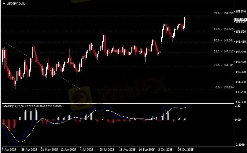 日线图显示美元兑日元强势冲高,当前企稳于151.60支撑。从MACD来看,快慢线拐向上行,白色动能柱显示汇价动能有限。汇价走势和动能柱的变化呈分歧。