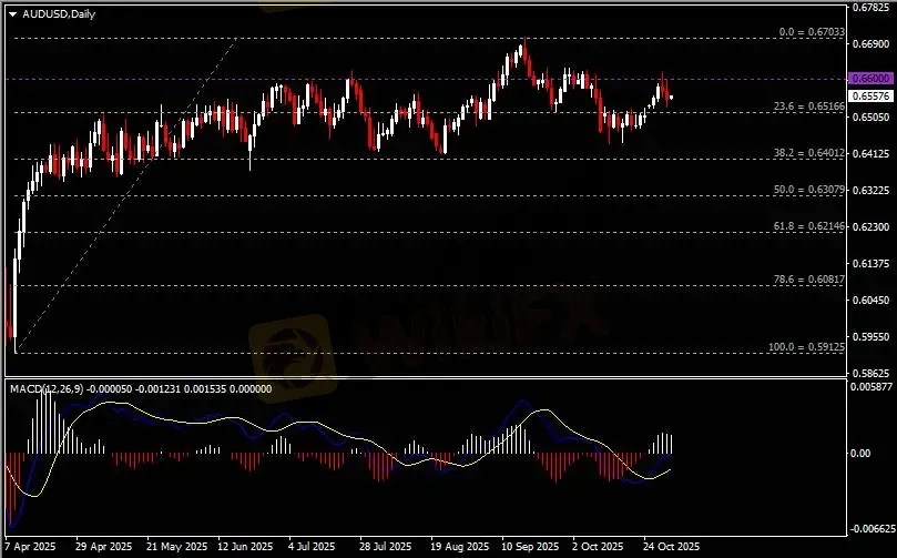 日线图显示澳元兑美元回调下跌,当前承压于0.66关键阻力。从MACD来看,快慢线向上扩张,白色动能柱则温和收缩。汇价走势基本和动能柱的变化一致。