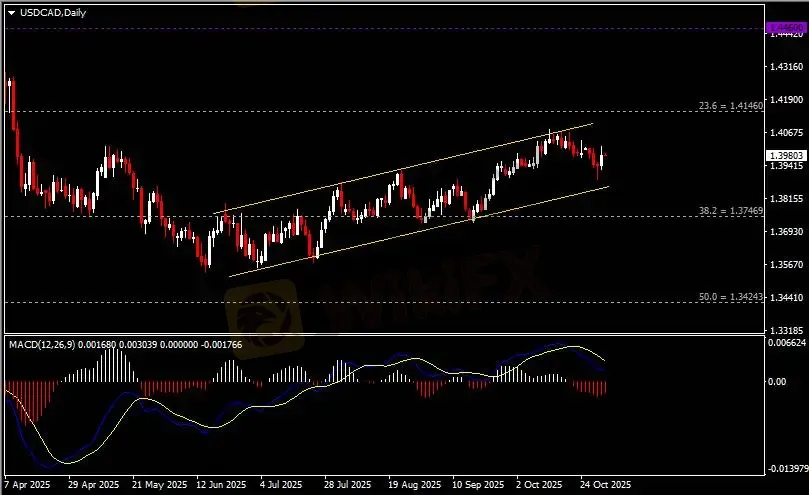日线图显示美元兑加元反弹上行,当前仍承压于上行通道顶线。从MACD来看,快慢线向下运行,红色动能柱则温和收缩。汇价走势基本和动能柱的变化一致。