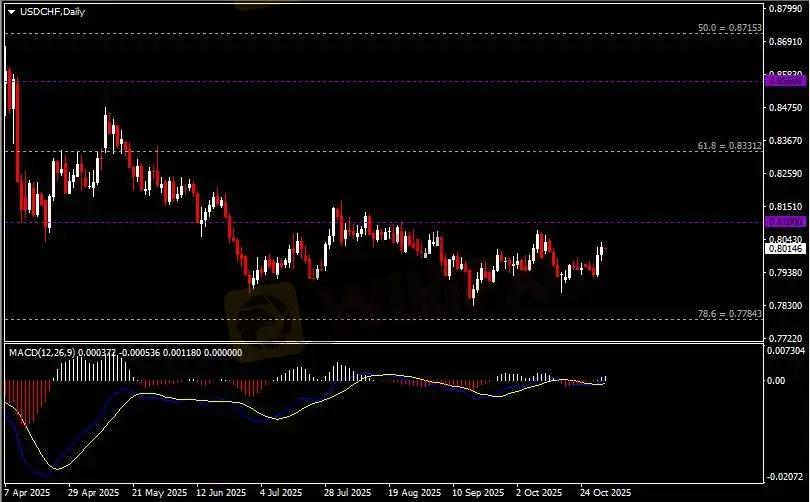日线图显示美元兑瑞郎震荡上涨,当前仍承压于0.81关键阻力。从MACD来看,快慢线金叉依旧,白色动能柱温和增量。汇价走势基本和动能柱的变化一致。