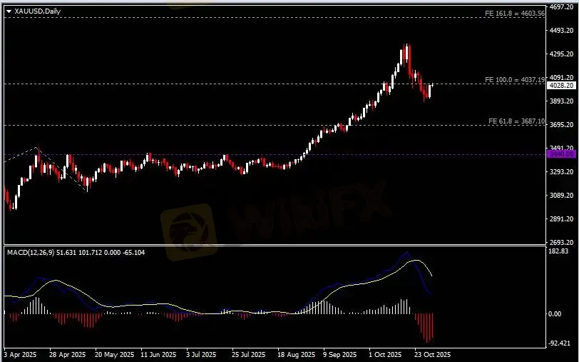 日线图显示金价触底反弹,当前回测4040阻力。从MACD来看,快慢线向下扩张,红色动能柱则温和收缩。金价走势基本和动能柱的变化一致。