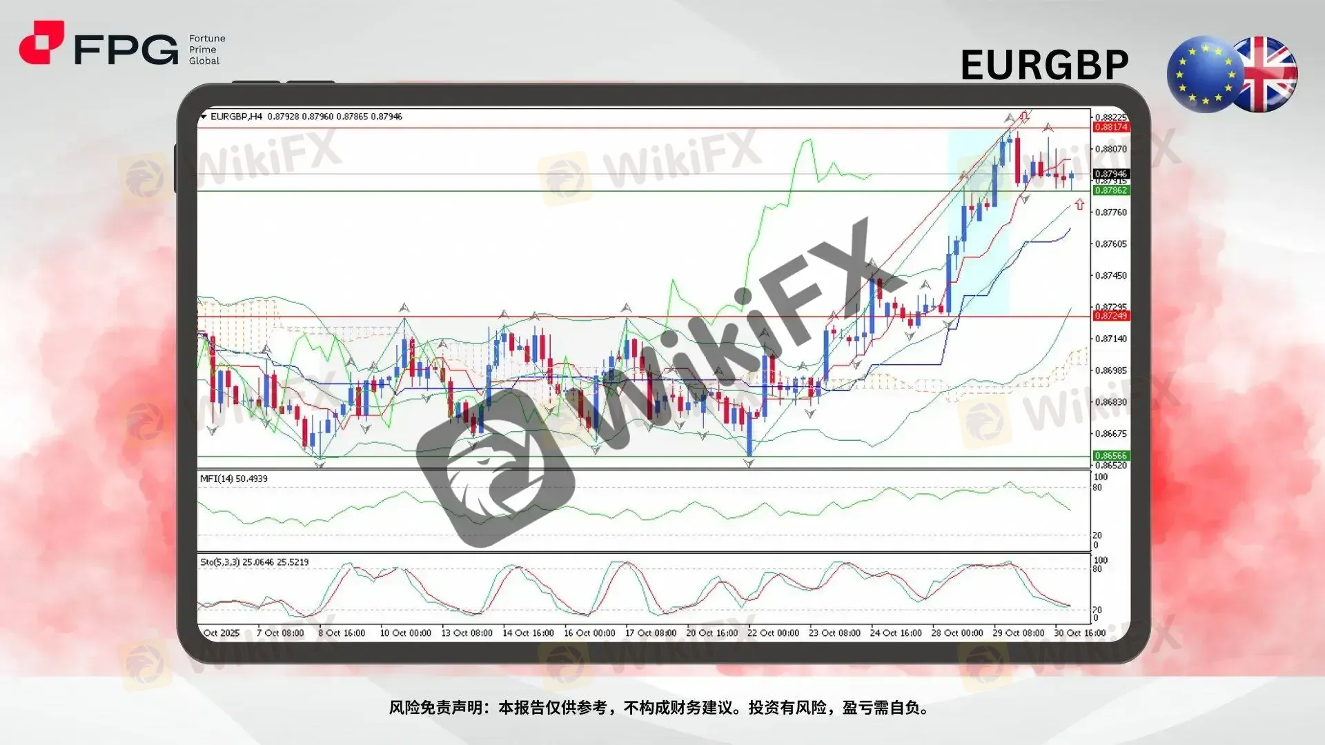 摘要:欧元/英镑(EUR/GBP)本周早些时候强势上行后,目前进入轻微修正阶段,现报约 0.8794,较近期高点 0.8817 略有回落,主要因部分多头获利了结,价格在关键支撑上方整固。尽管短线出现回调,但只要汇价仍处于上升趋势线及一目均衡云上方,中期多头结构依然完好。从技术面来看,欧元/英镑在突破 0.8725 阻力区后,形成新的支撑区间,走势仍维持于上升通道之内。汇价目前位于一目云层之上,并靠近布林
