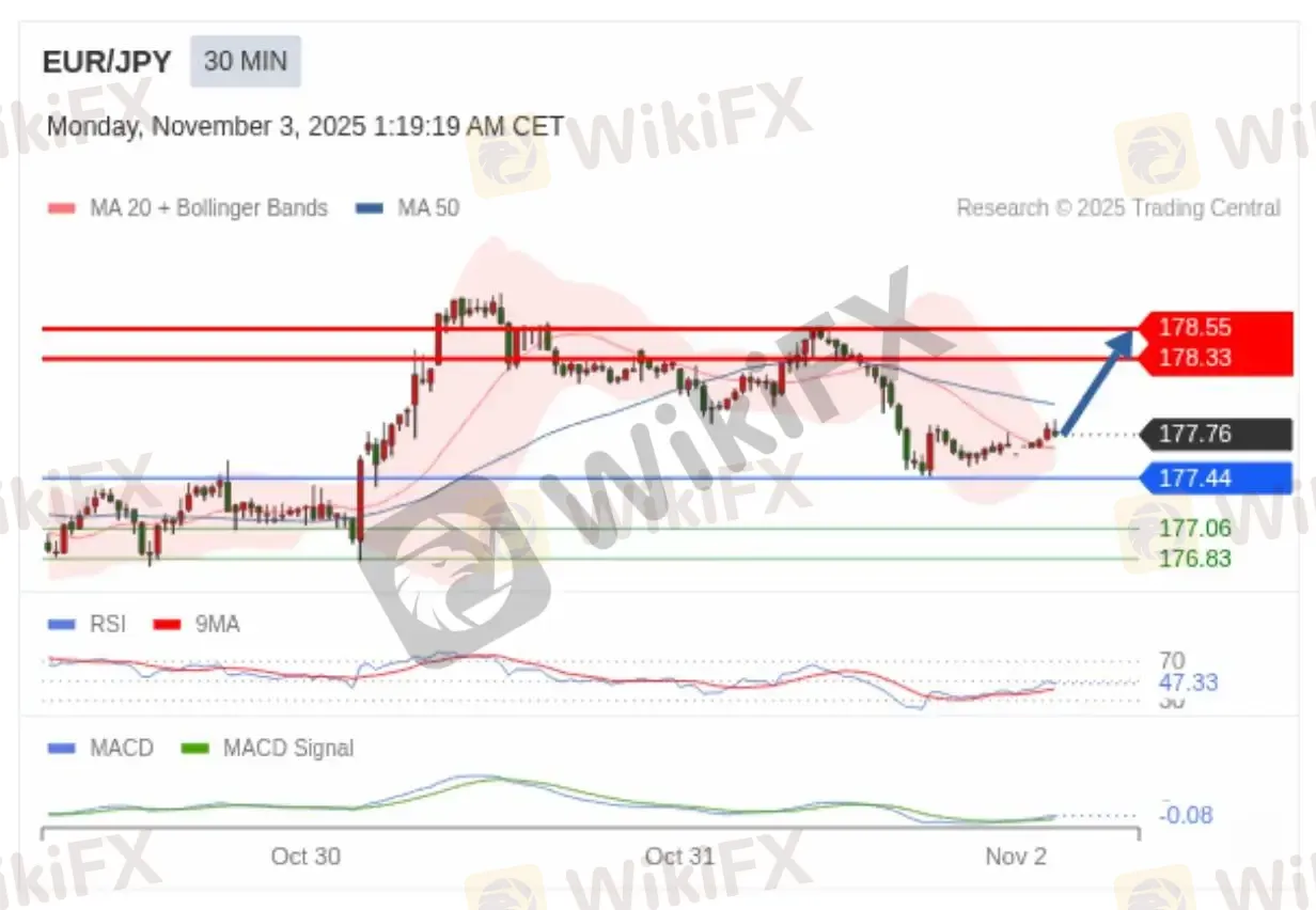欧元/日元 当日内 : 有上涨的可能,目标价位定在 178.55 。