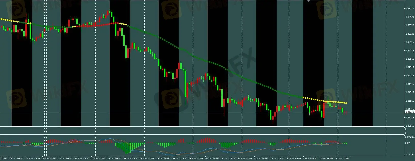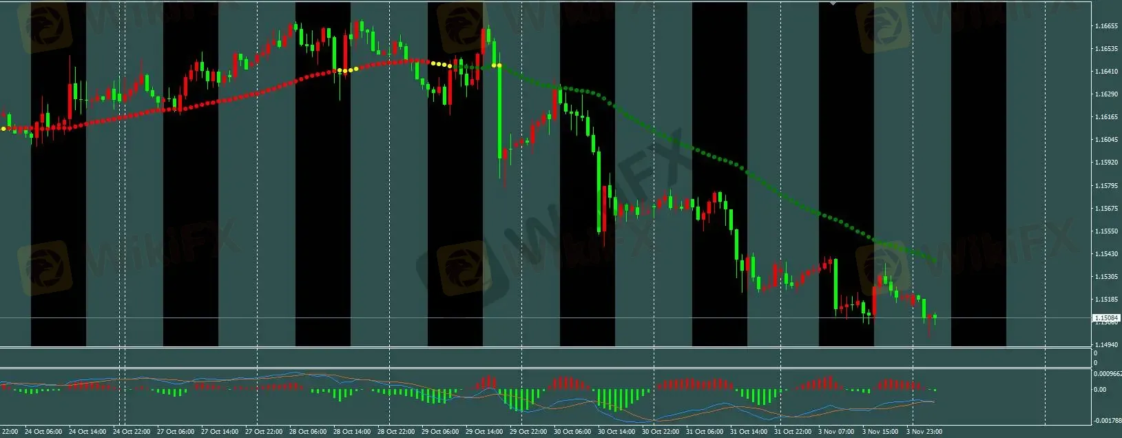 三色线交易策略:H1趋势线由绿转黄,下跌波幅已完,空单过滤,今日参考M5模型操作。