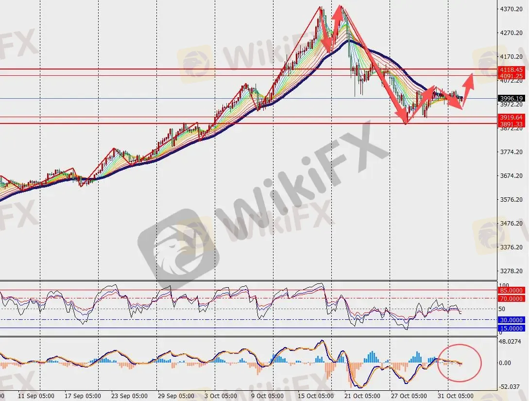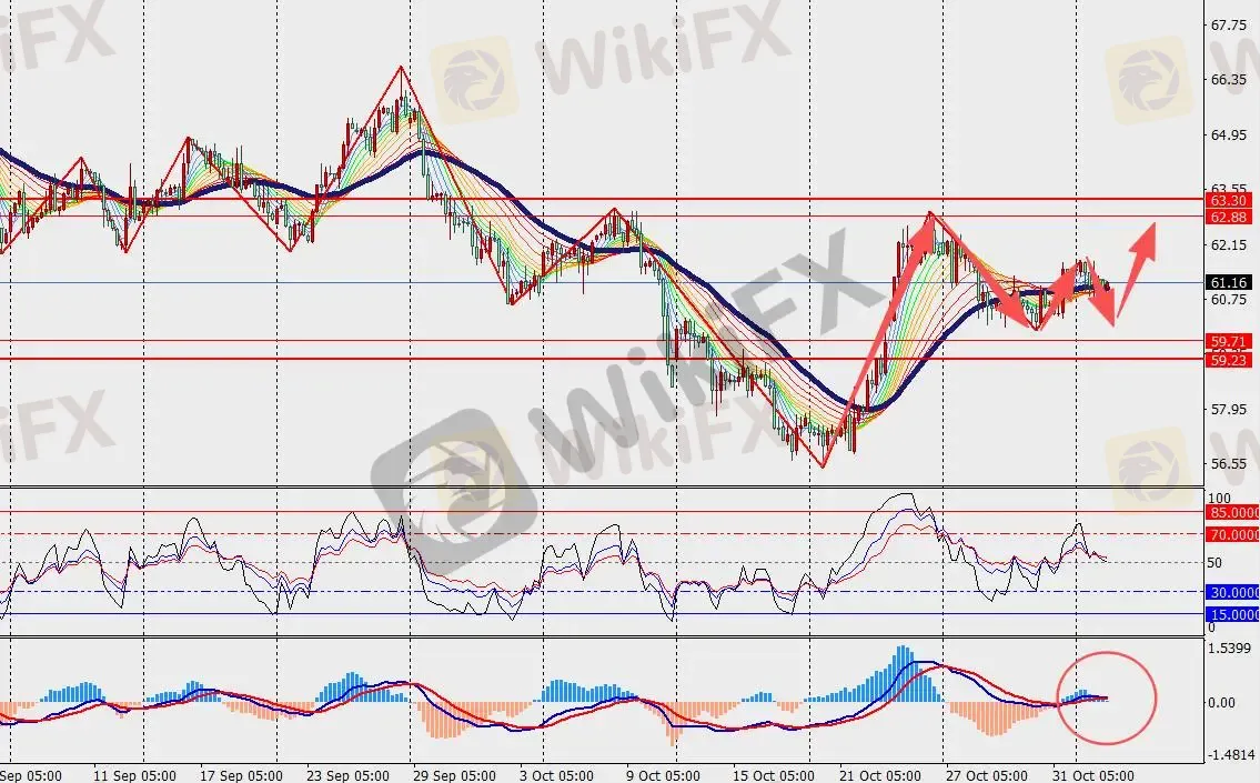 技术面:原油H4级别震荡反弹,并在48日多空分界线附近运行。另一方面,MACD双线和量能柱在零轴附近缩量。在制裁阴影、需求敏感和供应激增的多重夹击下,欧佩克这一决定如同一剂预防针,旨在守护油价稳定。