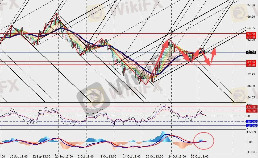 原油4小时级别震荡徘徊,MACD双线和量能柱在零轴附近缩量。油价未来之路似乎布满荆棘:如果需求复苏不及预期,或供应过剩超乎想象,油价下滑将不可避免。投资者需要密切关注亚洲买家的动向和俄罗斯的出口韧性。