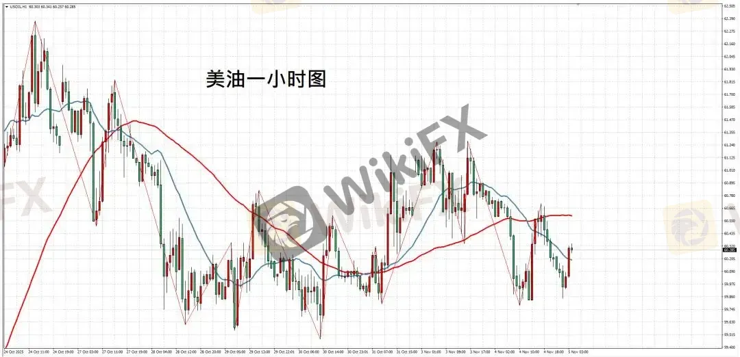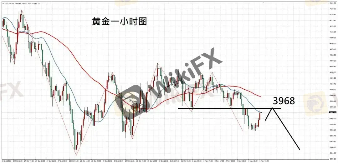 摘要:【基本面分析】美国政府关门持续逾一个月后,终于出现初步解冻迹象。国会两党资深议员释放谨慎乐观信号,暗示僵局或将打破,缓解市场对美国政经稳定性的担忧。利率期货市场方面,受美联储主席鲍威尔言论影响,对12月降息的预期已从一周前的90%下修至71%,不利贵金属表现。展望今夜,ADP就业报告将成为市场焦点,若就业数据未见放缓,黄金与白银等贵金属恐面临进一步卖压。【技术分析】黄金一小时图,走势震荡走低并刷新