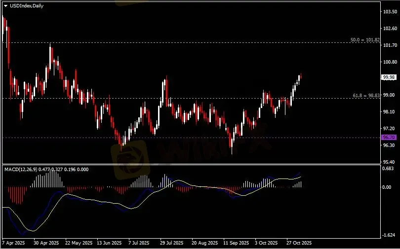 日线图显示美元指数震荡走强,当前企稳于98.80支撑。从MACD来看,快慢线向上运行,白色动能柱温和放量。指数走势基本和动能柱的变化一致。