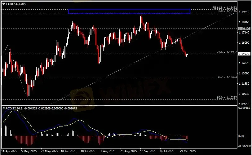 日线图显示欧元兑美元小幅收涨,当前测试1.15关键阻力。从MACD来看,快慢线向下运行,红色动能柱则略呈收缩。汇价走势基本和动能柱的变化一致。